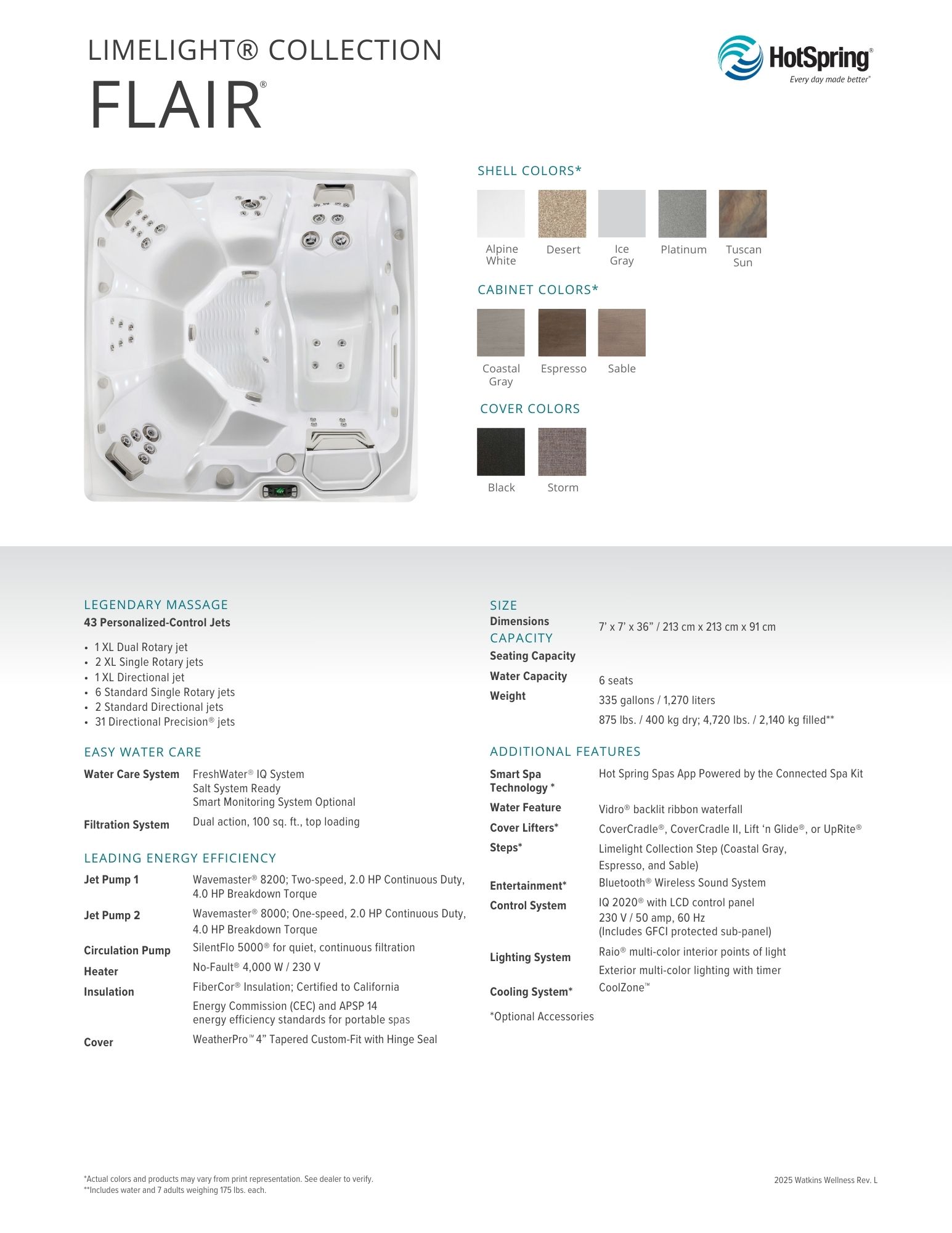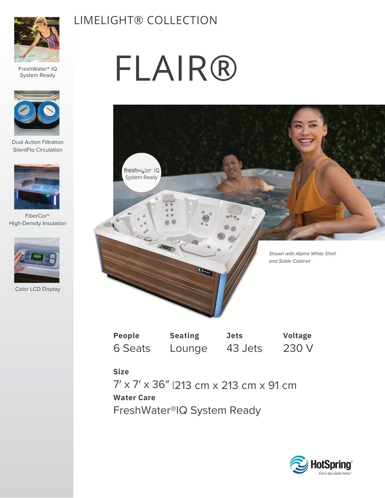 Discover the ultimate in relaxation with The Flair, a premium hot tub designed to elevate your experience. With six ergonomically designed seats at varying heights, it accommodates everyone perfectly. Indulge in a rejuvenating massage from the plush lounge seat and enjoy the invigorating sensation of 43 powerful jets. The Flair promises unparalleled comfort and a luxurious escape right in your backyard.