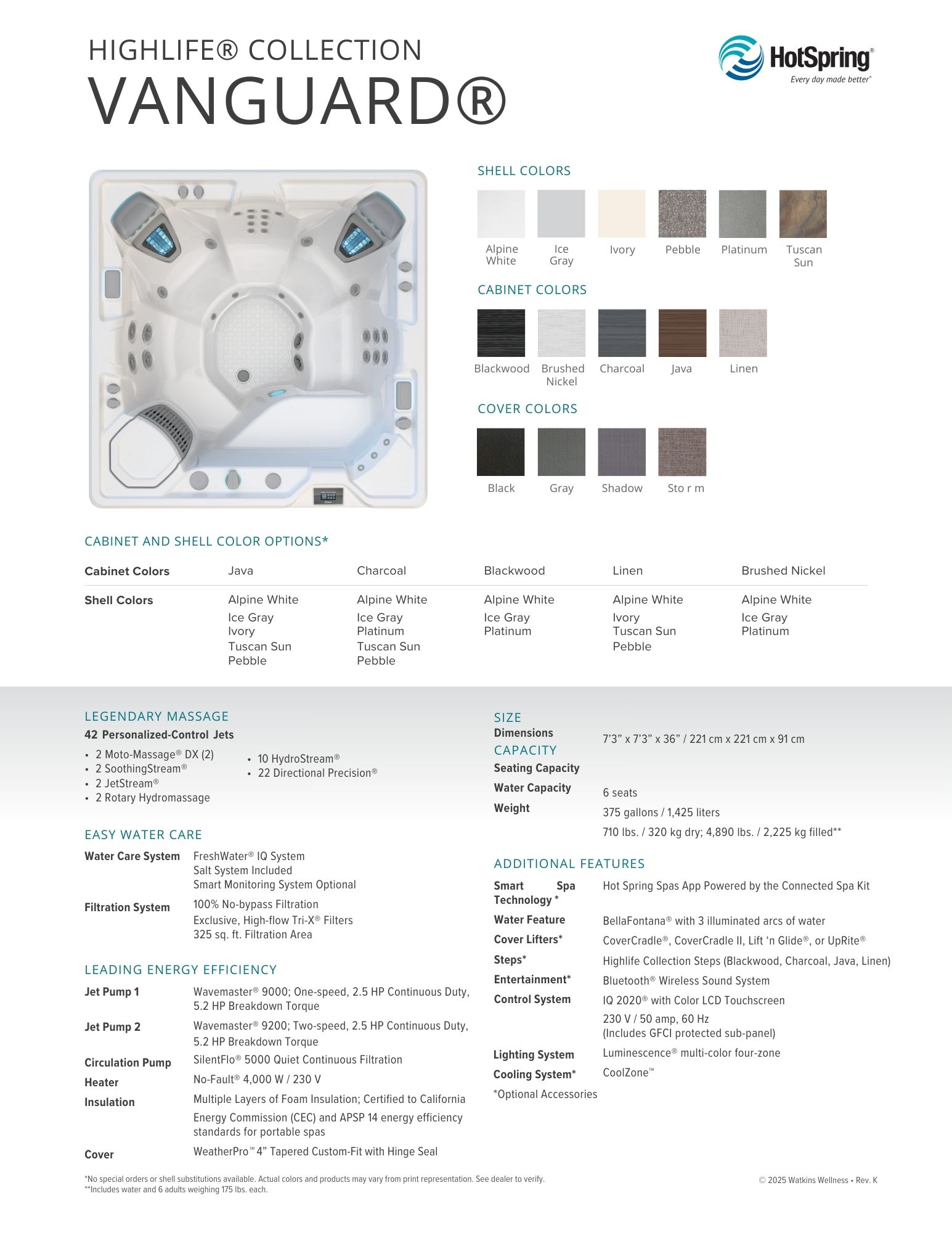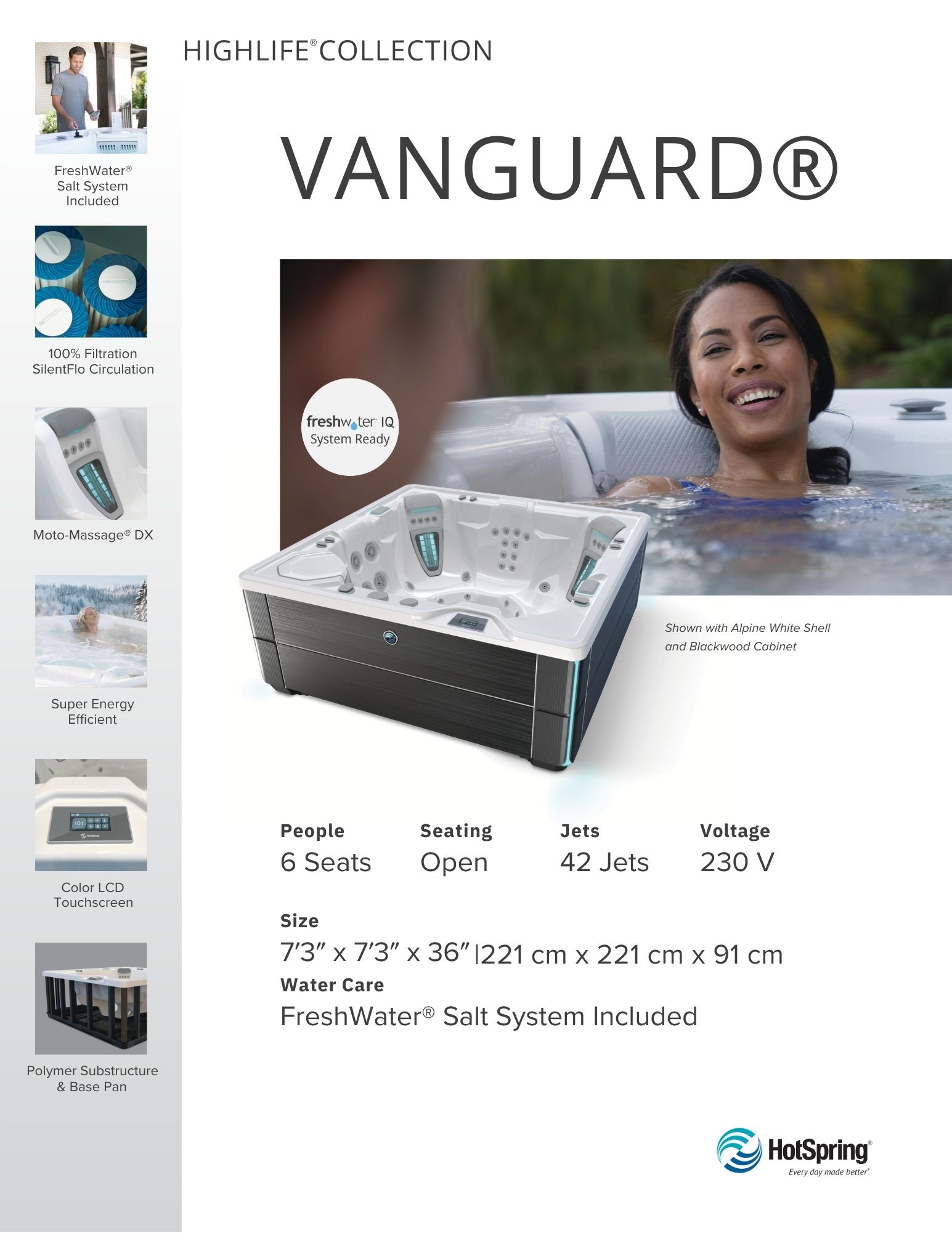 Experience unparalleled luxury with the Vanguard, a premium spa designed to comfortably accommodate up to six adults. Featuring cutting-edge filtration technology and ready for saltwater use, the Vanguard guarantees the purest, cleanest water available, ensuring an exceptional spa experience every time.